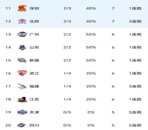 随着广东+上海+广厦全赢球,CBA最新积分榜如下:2队全胜+2队全败